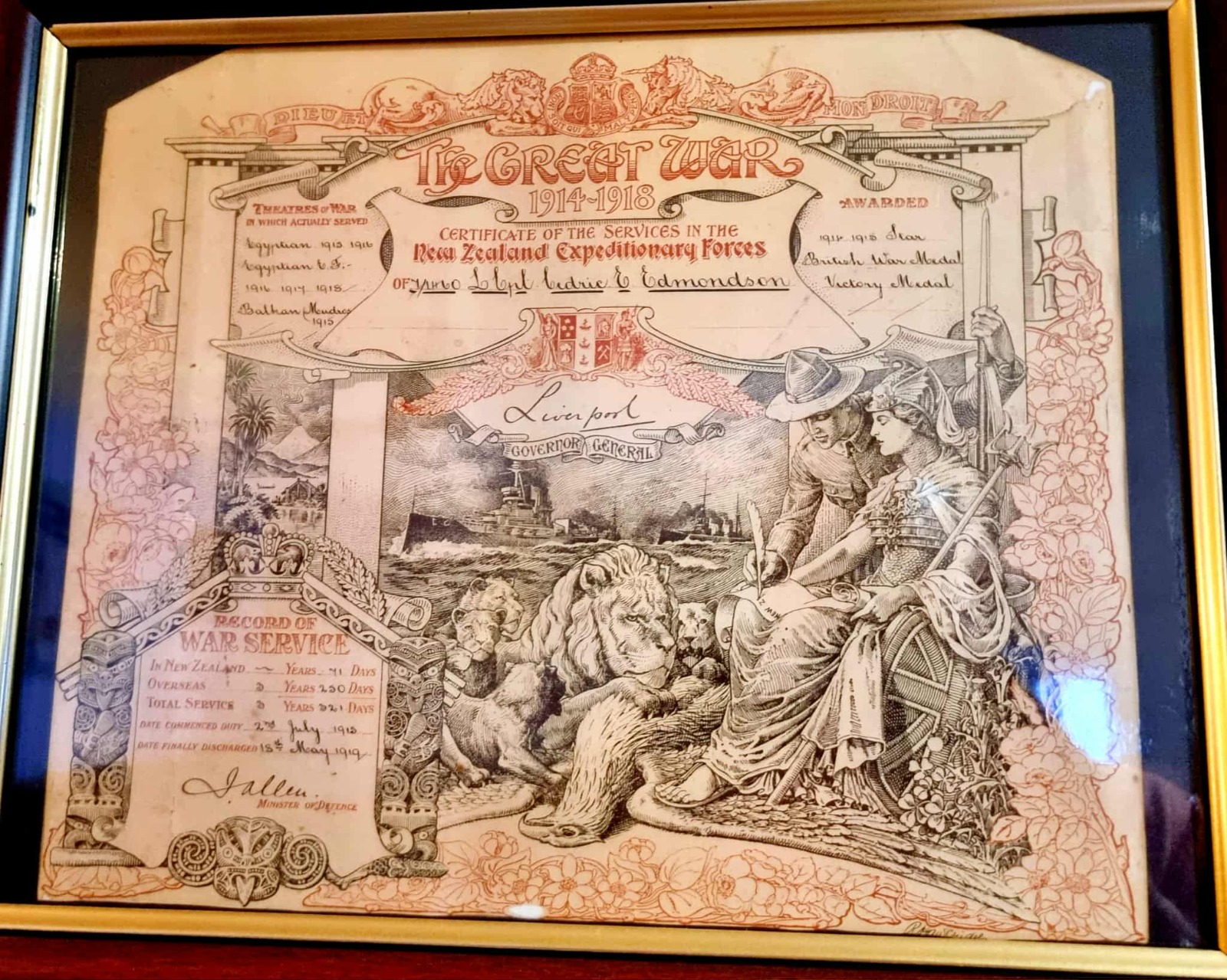 Edmondson added that his grandfather returned to New Zealand after World War I, worked on a farm for a while, later became a fisherman, and passed away in 1972 at the age of 76. He also noted that as keepsakes, he has his grandfather’s bayonet, some brass uniform buttons, service ribbons, and a copy of his war certificate, while his older brother has the war medals.